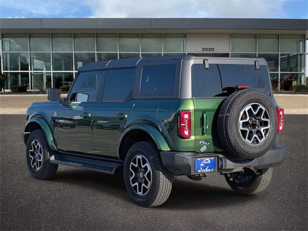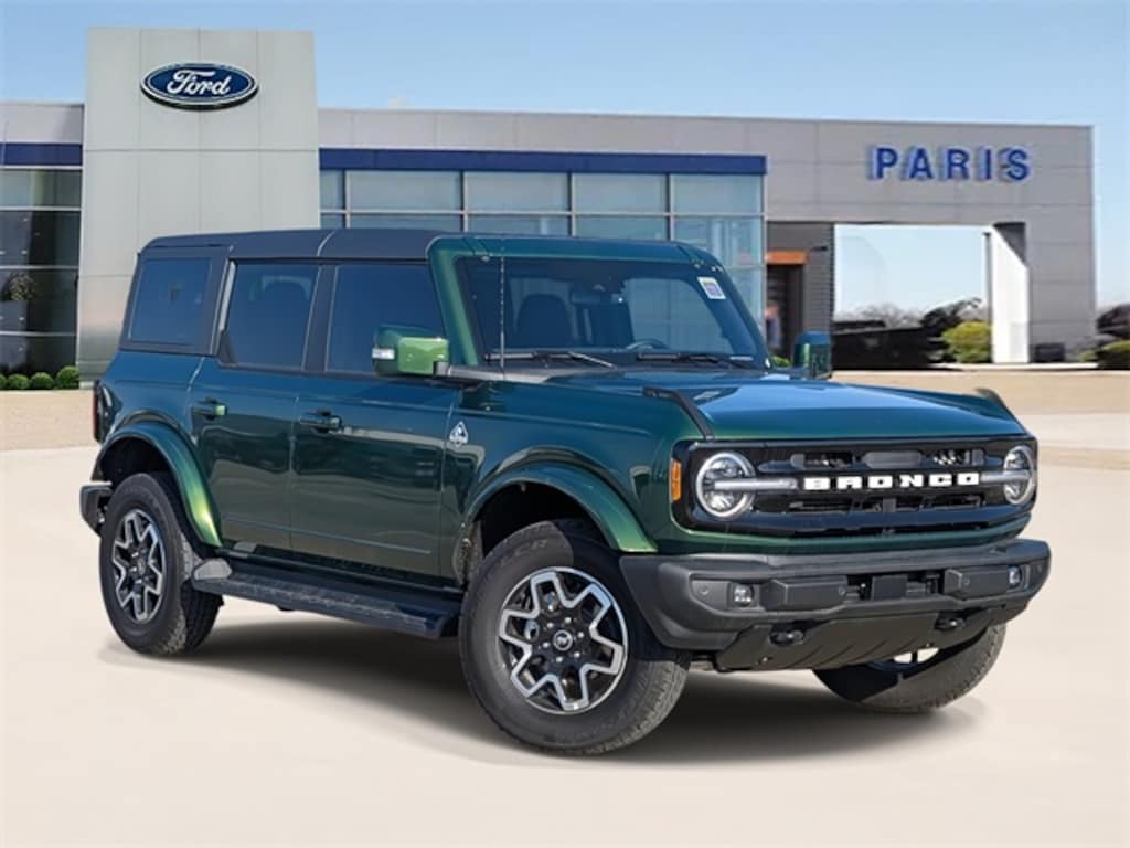 Green Metallic 2025 Ford Bronco Outer Banks 4WD 10-Speed Automatic 2.7L EcoBoost V6 Equipment Group 314A Lux Package (360-Degree Camera, Adaptive Cruise Control, Evasive Steering Assist, Front Parking Sensors, Information on Demand Panel, Radio: B&O Sound System by Bang & Olufsen, Sideview Mirrors, and Universal Garage Door Opener), 18" Bright Machined Aluminum Wheels, 3.73 Axle Ratio, 4-Wheel Disc Brakes, 7 Speakers, ABS brakes, Air Conditioning, Alloy wheels, AM/FM radio: SiriusXM with 360L, AM/FM Stereo, Auto High-beam Headlights, Auto-dimming Rear-View mirror, Automatic temperature control, Brake assist, Carbonized Gray Molded-In-Color Hard Top, Compass, Connected Navigation, Delay-off headlights, Driver door bin, Driver vanity mirror, Dual front impact airbags, Dual front side impact airbags, Electronic Stability Control, Emergency communication system: 911 Assist, Exterior Parking Camera Rear, Front anti-roll bar, Front Bucket Seats, Front Center Armrest, Front dual zone A/C, Front fog lights, Front License Plate Bracket, Front reading lights, Front wheel independent suspension, Fully automatic headlights, Hard Top Sound Deadening Headliner, Heated door mirrors, Heated front seats, Heated Leather-Trimmed/Vinyl Bucket Seats, Heated steering wheel, Illuminated entry, Integrated roll-over protection, Internet access capable: FordPass Connect, Leather Shift Knob, Low tire pressure warning, Navigation system: Connected Navigation, Occupant sensing airbag, Outside temperature display, Overhead airbag, Overhead console, Panic alarm, Passenger door bin, Passenger vanity mirror, Power door mirrors, Power driver seat, Power passenger seat, Power steering, Power windows, Radio data system, Rear seat center armrest, Rear-Window Defroster & Washer, Remote keyless entry, Security system, SiriusXM w/360L, Speed control, Split folding rear seat, Steering wheel mounted audio controls, SYNC 4, Tachometer, Telescoping steering wheel, Tilt steering wheel, Traction control, Trip computer, Variably intermittent wipers, and Voltmeter.