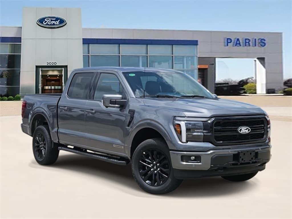 Carbonized Gray Metallic 2025 Ford F-150 Lariat 4WD 10-Speed Automatic 3.5L PowerBoost Full-Hybrid V6 3.5L PowerBoost Full-Hybrid V6, 4WD, 3.31 Axle Ratio, 4-Wheel Disc Brakes, 8 Speakers, ABS brakes, ActiveX Trimmed Bucket Seats, Adjustable pedals, Air Conditioning, Alloy wheels, AM/FM radio: SiriusXM with 360L, Auto High-beam Headlights, Auto-dimming door mirrors, Auto-dimming Rear-View mirror, Automatic temperature control, Brake assist, Bumpers: chrome, Chrome wheels, Compass, Delay-off headlights, Driver door bin, Driver vanity mirror, Dual front impact airbags, Dual front side impact airbags, Electronic Stability Control, Emergency communication system: SYNC 4 911 Assist, Front anti-roll bar, Front Bucket Seats, Front Center Armrest, Front dual zone A/C, Front fog lights, Front reading lights, Front wheel independent suspension, Fully automatic headlights, Garage door transmitter, Heated door mirrors, Heated front seats, Heated steering wheel, Illuminated entry, Low tire pressure warning, Memory seat, Navigation system: Connected Navigation, Occupant sensing airbag, Outside temperature display, Overhead airbag, Overhead console, Panic alarm, Passenger door bin, Passenger vanity mirror, Pedal memory, Power door mirrors, Power driver seat, Power passenger seat, Power steering, Power windows, Radio data system, Radio: B&O Sound System by Bang & Olufsen, Rain sensing wipers, Rear reading lights, Rear seat center armrest, Rear step bumper, Rear window defroster, Remote keyless entry, Security system, Speed control, Split folding rear seat, Steering wheel mounted audio controls, SYNC 4 w/Enhanced Voice Recognition, Tachometer, Telescoping steering wheel, Tilt steering wheel, Traction control, Trip computer, Turn signal indicator mirrors, Variably intermittent wipers, Ventilated front seats, Voltmeter, and Wheels: 18" Chrome-Like PVD. 3.5L PowerBoost Full-Hybrid V6, 4WD.