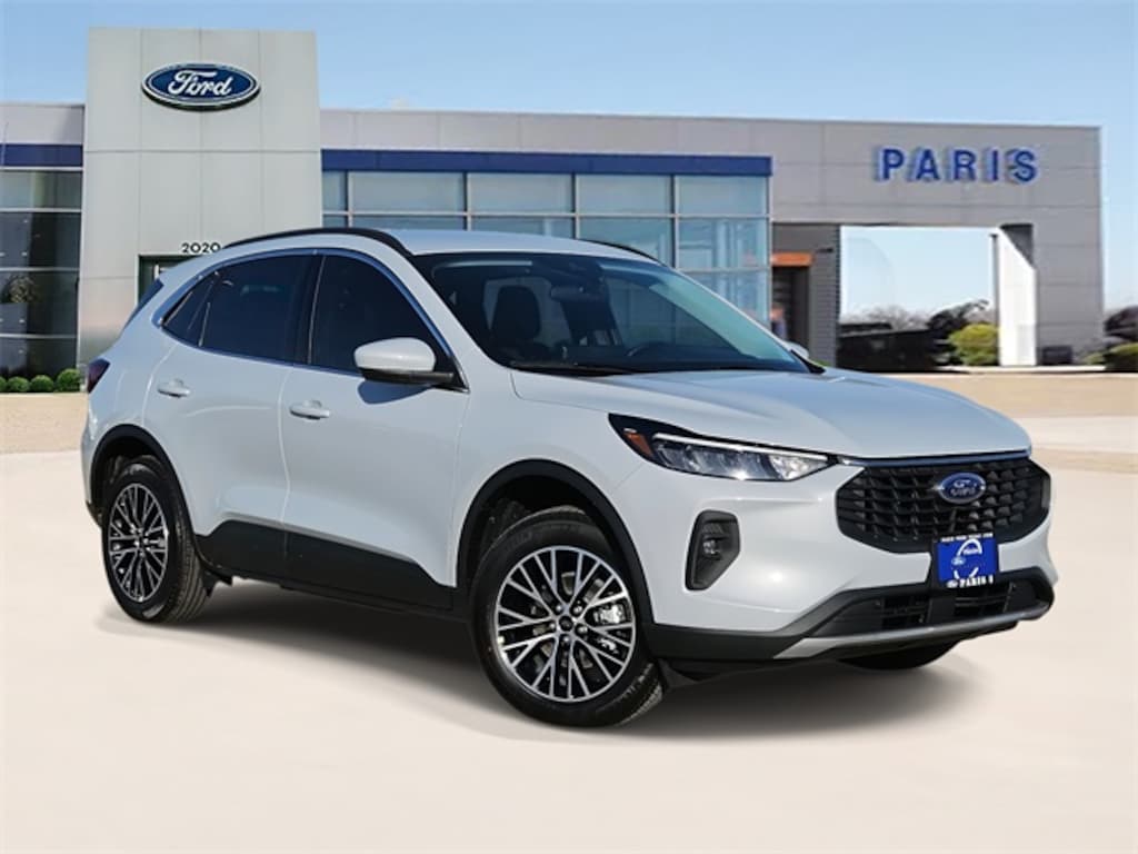 space silver metallic 2026 Ford Escape Plug-In Hybrid FWD eCVT 2.5L iVCT 2.5L iVCT, 2.91 Axle Ratio, 4-Wheel Disc Brakes, 6 Speakers, ABS brakes, Air Conditioning, Alloy wheels, Auto High-beam Headlights, Automatic temperature control, Brake assist, Bumpers: body-color, Compass, Delay-off headlights, Driver door bin, Driver vanity mirror, Dual front impact airbags, Dual front side impact airbags, Electronic Stability Control, Emergency communication system: SYNC 4 911 Assist, Ford App, Four wheel independent suspension, Front anti-roll bar, Front Bucket Seats, Front Center Armrest, Front dual zone A/C, Front fog lights, Front reading lights, Fully automatic headlights, Heated door mirrors, Heated front seats, Heated steering wheel, Illuminated entry, Knee airbag, Low tire pressure warning, Navigation system: Connected Navigation, Occupant sensing airbag, Outside temperature display, Overhead airbag, Overhead console, Panic alarm, Passenger door bin, Passenger vanity mirror, Power door mirrors, Power driver seat, Power Liftgate, Power steering, Power windows, Radio data system, Rear anti-roll bar, Rear reading lights, Rear seat center armrest, Rear window defroster, Rear window wiper, Remote keyless entry, Speed control, Speed-sensing steering, Speed-Sensitive Wipers, Split folding rear seat, Spoiler, Steering wheel mounted audio controls, Telescoping steering wheel, Tilt steering wheel, Traction control, Trip computer, and Variably intermittent wipers. 2.5L iVCT.