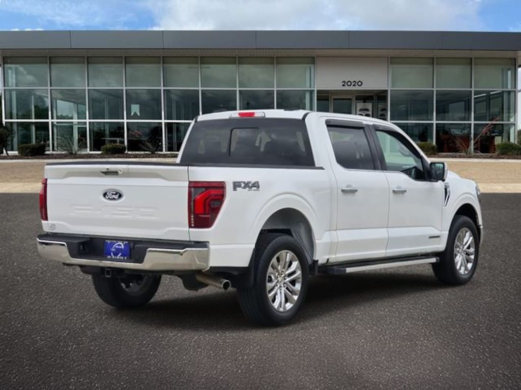 This 2024 White Metallic Ford F-150 Lariat 4WD is well equipped and includes these features and benefits: Equipment Group 501A Standard, FX4 Off-Road Package (4x4 FX4 Off-Road Bodyside Decal, Hill Descent Control, Monotube Rear Shocks, Off-Road Tuned Front Shock Absorbers, and Rock Crawl Mode), 3.5L PowerBoost Full-Hybrid V6, 4WD, 4-Wheel Disc Brakes, 8 Speakers, ABS brakes, Adjustable pedals, Air Conditioning, Alloy wheels, AM/FM radio: SiriusXM with 360L, Auto High-beam Headlights, Auto-dimming door mirrors, Auto-dimming Rear-View mirror, Automatic temperature control, Brake assist, Bumpers: chrome, Chrome wheels, Compass, Delay-off headlights, Driver door bin, Driver vanity mirror, Dual front impact airbags, Dual front side impact airbags, Electronic Stability Control, Emergency communication system: SYNC 4 911 Assist, Front anti-roll bar, Front Bucket Seats, Front Center Armrest, Front dual zone A/C, Front fog lights, Front License Plate Bracket, Front reading lights, Front wheel independent suspension, Fully automatic headlights, Garage door transmitter, Heated door mirrors, Heated front seats, Heated steering wheel, Illuminated entry, Leather-Trimmed Bucket Seats, Low tire pressure warning, Memory seat, Navigation system: Connected Navigation, Occupant sensing airbag, Outside temperature display, Overhead airbag, Overhead console, Panic alarm, Passenger door bin, Passenger vanity mirror, Pedal memory, Power door mirrors, Power driver seat, Power passenger seat, Power steering, Power windows, Radio data system, Radio: B&O Sound System by Bang & Olufsen, Rain sensing wipers, Rear reading lights, Rear seat center armrest, Rear step bumper, Rear window defroster, Remote keyless entry, Security system, Speed control, Split folding rear seat, Steering wheel mounted audio controls, SYNC 4 w/Enhanced Voice Recognition, Tachometer, Telescoping steering wheel, Tilt steering wheel, Traction control, Trip computer, Turn signal indicator mirrors, Twin Panel Moonroof, Variably intermittent wipers, Ventilated front seats, Voltmeter, and Wheels: 20" Chrome-Like PVD.